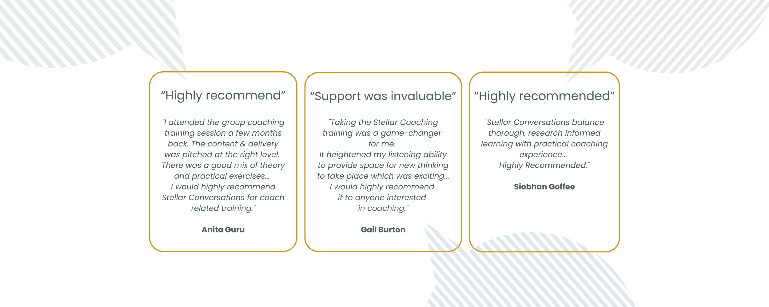 At Stellar Conversations, we work with people-led organisations, equipping them to have impactful conversations. We provide coaching, coach training and consultancy to help you build great coaching cultures where impactful coaching conversations are the norm.